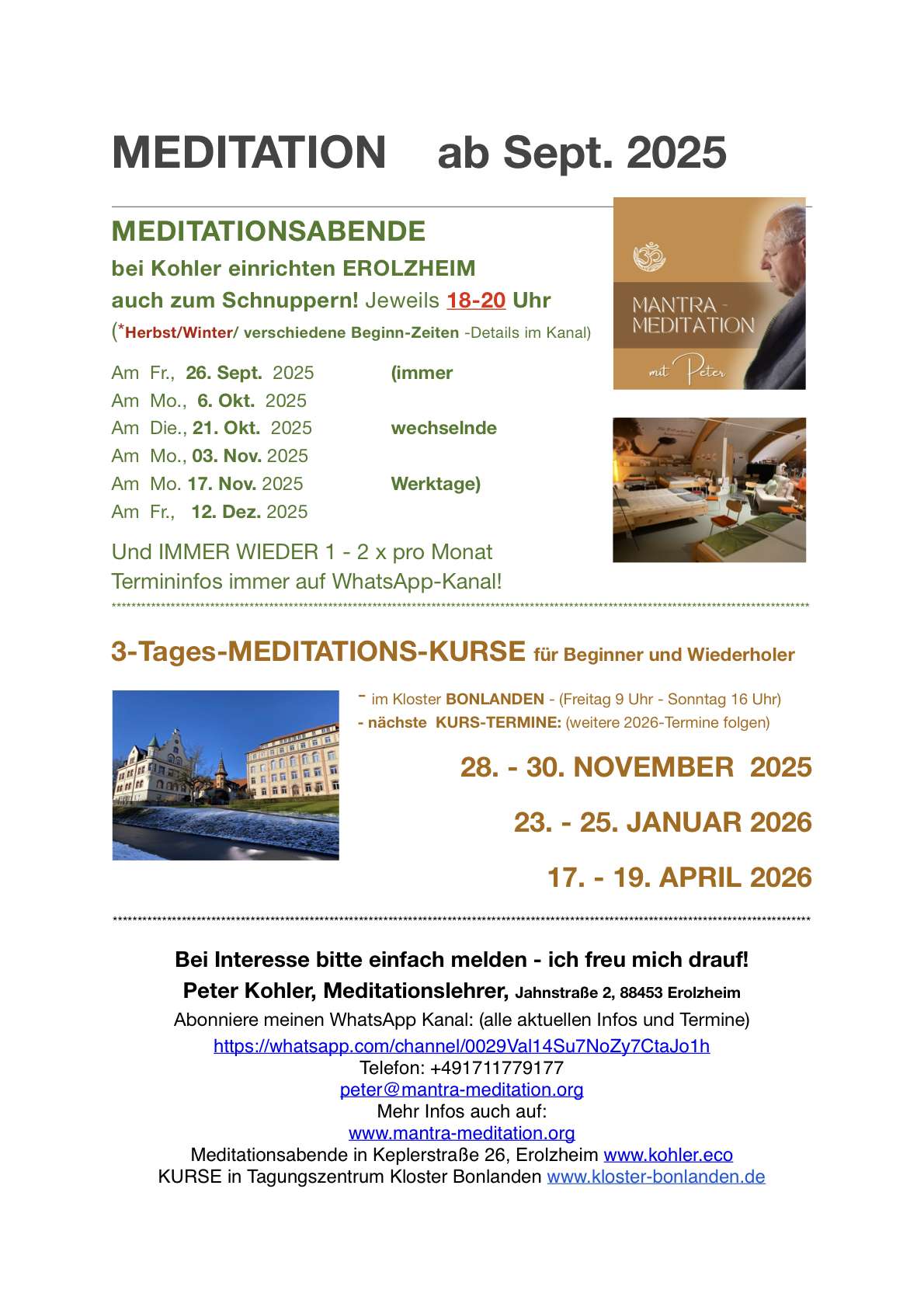 Ich war im Nov. 24 und jetzt im Febr. 25 bei Peters Meditationsseminaren dabei. Beide haben mich gleichermaßen begeistert.