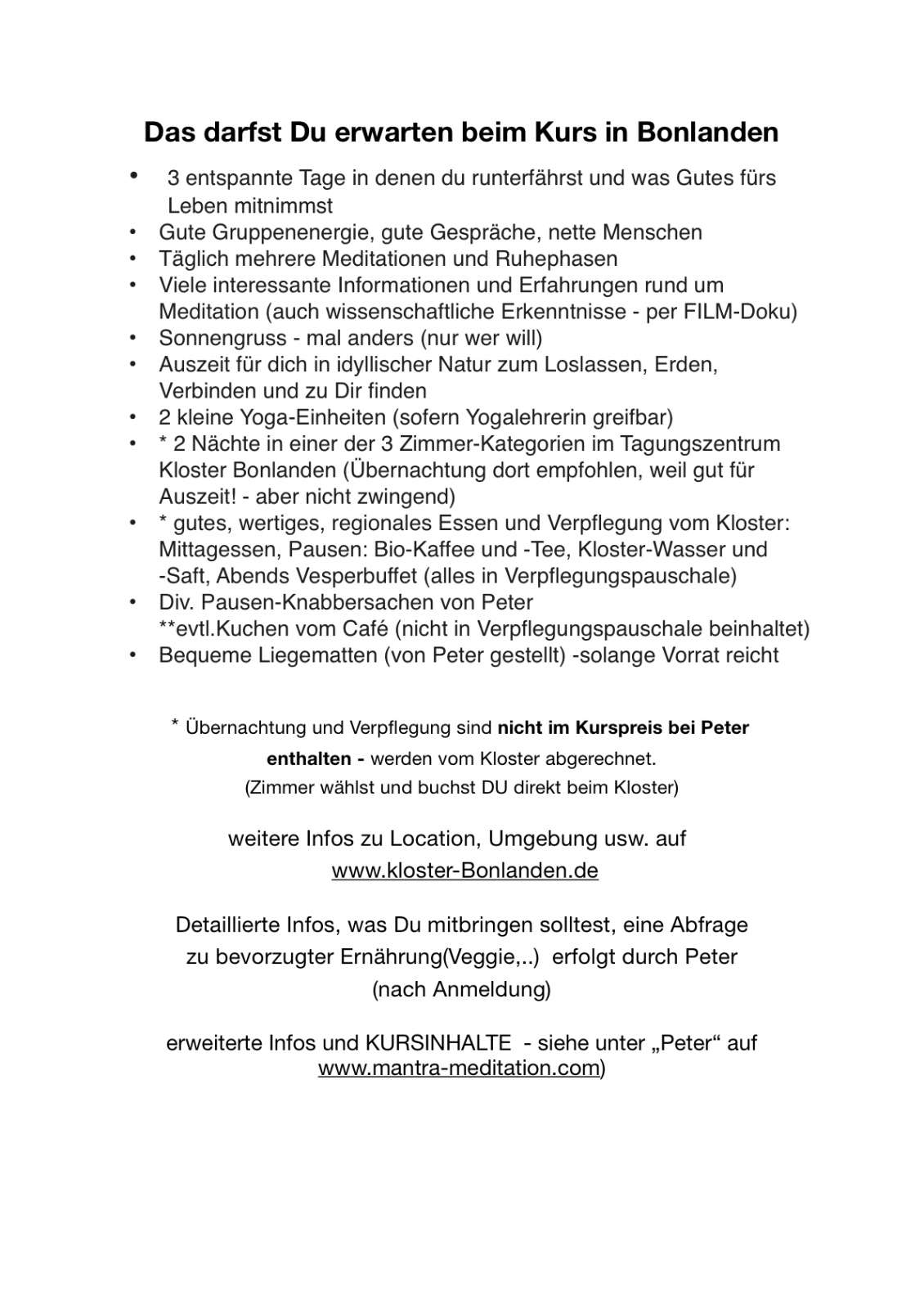 Der Kurs war für uns eine große Bereicherung. Durch seine ruhige und einfühlsame Art hat uns Peter hervorragend in die Mantra-Meditation eingeführt. Sehr gut fanden wir auch die Auflockerung mit Yoga-Übungen durch eine perfekte Yoga-Lehrerin. Bitte beibehalten. Die Räumlichkeiten und die Unterbringung passten wunderbar zum Kurs und der harmonischen Gruppe, bei der der Spaßfaktor auch nicht zu kurz kam. Auch die Offenheit innerhalb der Gruppe war sehr wohltuend und bereichernd. Wir freuen uns schon auf einen Auffrischungskurs.